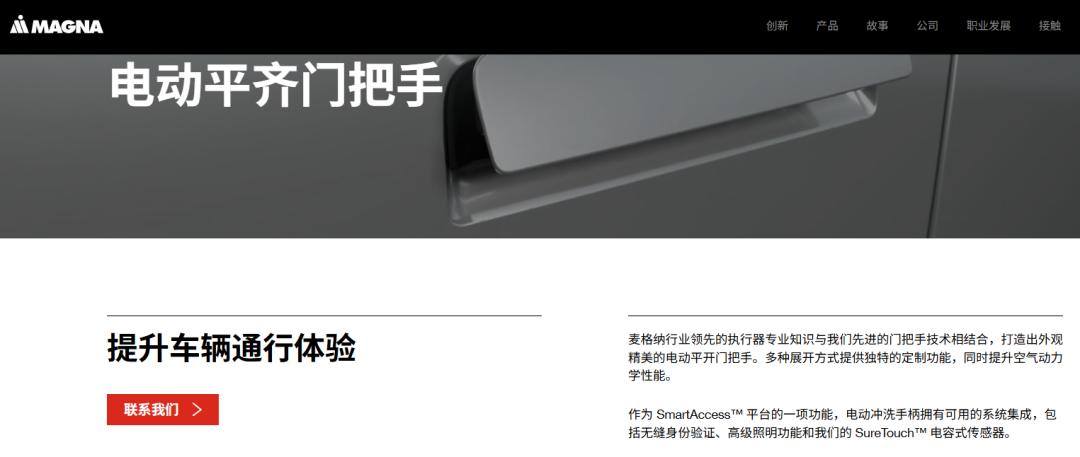 所以在 2012-2017 年那阵,不只是车企们开始尝试隐藏式门把手的设计( 捷豹、路虎等 ),MAGNA、HUF 和 Brose 这样的供应商也都快速推出了很多隐藏式门把手的方案,来吸引更多车企掏钱。