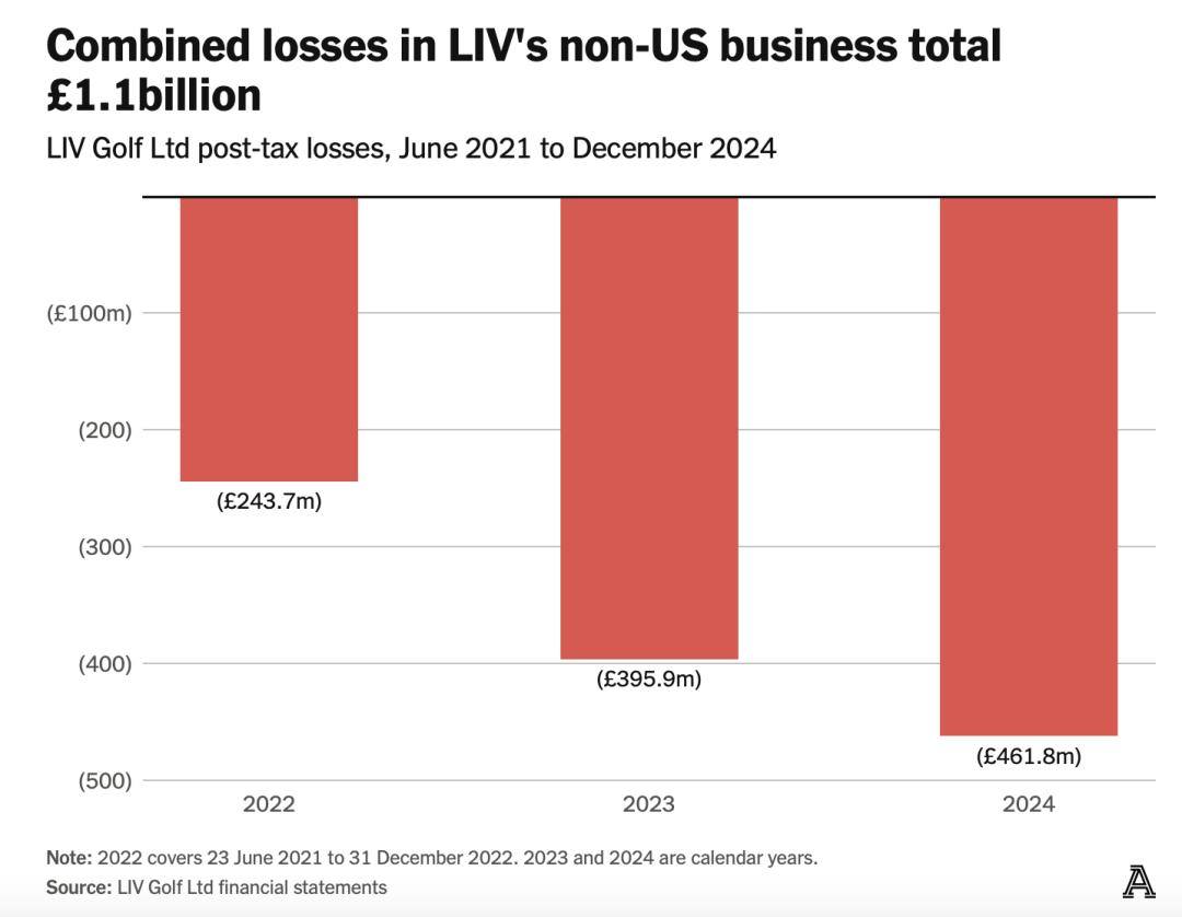 LIV Golf Ltd三年亏掉11亿美金。图中货币单位应为美元($),而非英镑(£)。图片来源于:《The Athletic》