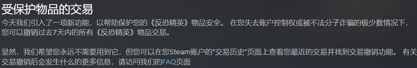 今年7月,V社又给《CS2》更新了交易保护机制。简单来说,饰品在被交易后,会进入为期7天的交易保护期(冷却期),在此期间受保护饰品不可被消耗、修改或转移,若玩家发现自己被诈骗、账号被劫、或者不慎将价值很高的饰品交易出去,可以通过这个机制将饰品要回。但撤回交易、要回饰品的Steam账号会在30天内无法使用Steam市场以及交易功能,并且Steam客服不会提前解封。