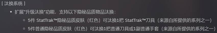 10月23日凌晨,Valve(下称V社)在《CS2》中推出补丁,其中一项是拓展游戏里的汰换系统(Trade Up Contract),使得玩家可以用5个红色枪械皮肤,汰换(合成)1把刀具皮肤或1副手套饰品。