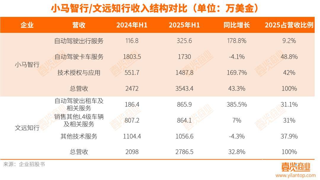 相对地,文远知行的营收结构更加均衡。2025年上半年,总营收为2786.5万美元,同比增长32.8%。其中,自动驾驶出租车及相关服务售出865.9万美元,暴增385%,贡献了31.1%的营收;L4级车辆销售及相关服务(包括小巴、货车等)占比31%,保持平稳;其他技术服务贡献37.9%,略有下降。