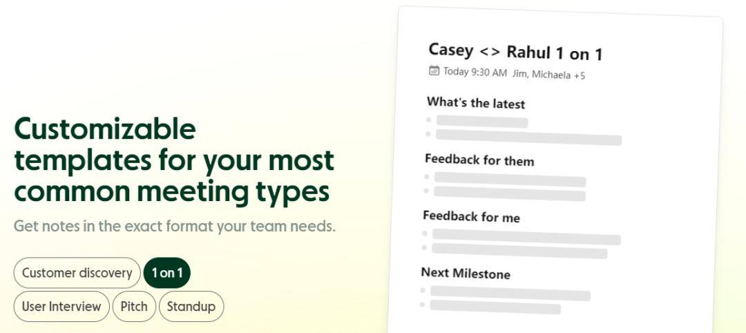 例如,在Granola中,用户可以预先根据会议类型选择不同的场景模板。在销售类会议中,应用会更关注客户的需求。在招聘类会议中,则会用更多余力去分析应聘者的背景信息和过往成绩。而在“一对一”的会议模式下,Granola会以更加敏锐的触觉来感知对话双方的语言特质,尽可能个性化地记录与会者所表达出的信息要点。