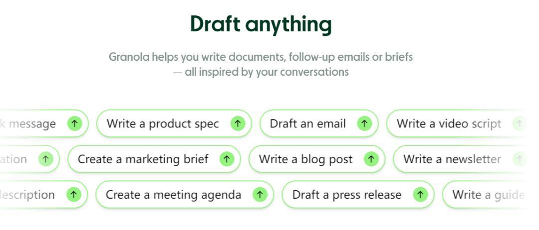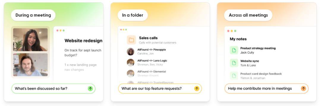 Granola的各项产品功能,也正是围绕这一原则而设置的。除了“人工草记+AI补全”这个核心大招,Granola还为产品添加了多项尊重人性、遵从人类本能直觉的实用招式。