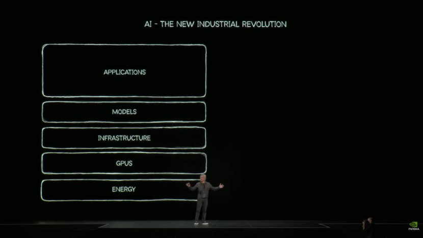 在能源之上还有这些GPU。这些GPU被连接到、集成到我稍后将展示的基础设施中。在这项基础设施之上——它由巨型数据中心构成,其规模轻松达到这个房间的数倍之多。巨大的能量随后通过名为GPU超级计算机的新设备转化,从而生成数据。这些数字被称为tokens。