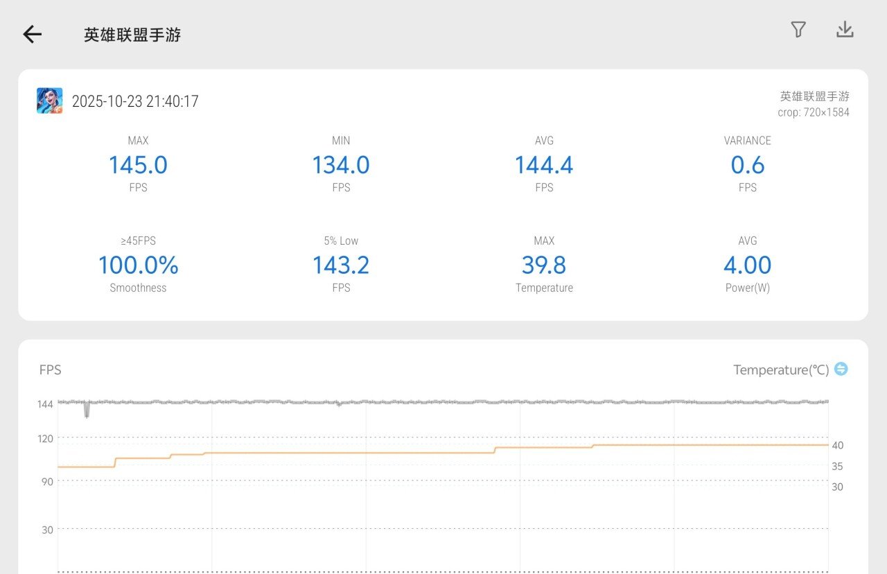像是《英雄联盟手游》这种对硬件压力基本构不成威胁的轻度游戏,在iQOO Neo11上居然有144Hz选项,全程测试下来也能做到144帧基本跑满,游戏体验又高了一截。