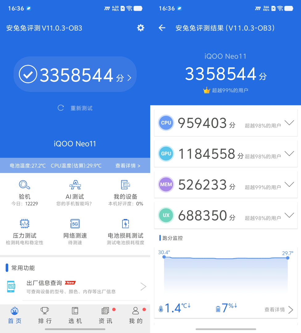 在室温24°C的情况下,iQOO Neo11轻松跑到了335万分的安兔兔成绩。