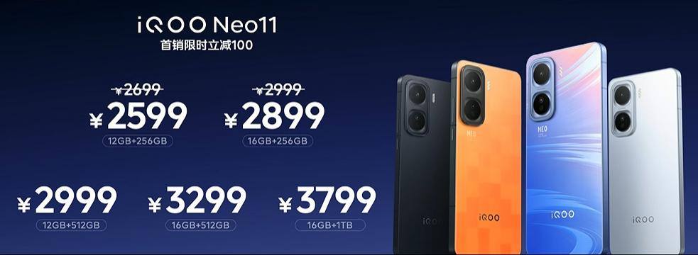 价格方面,iQOO Neo11首发立减100元,12GB+256GB版定价2599元;16GB+256GB版定价2899元;12GB+512GB版定价2999元;16GB+512GB版定价3299元;16GB+1TB版定价3799元,即日起正式开售。