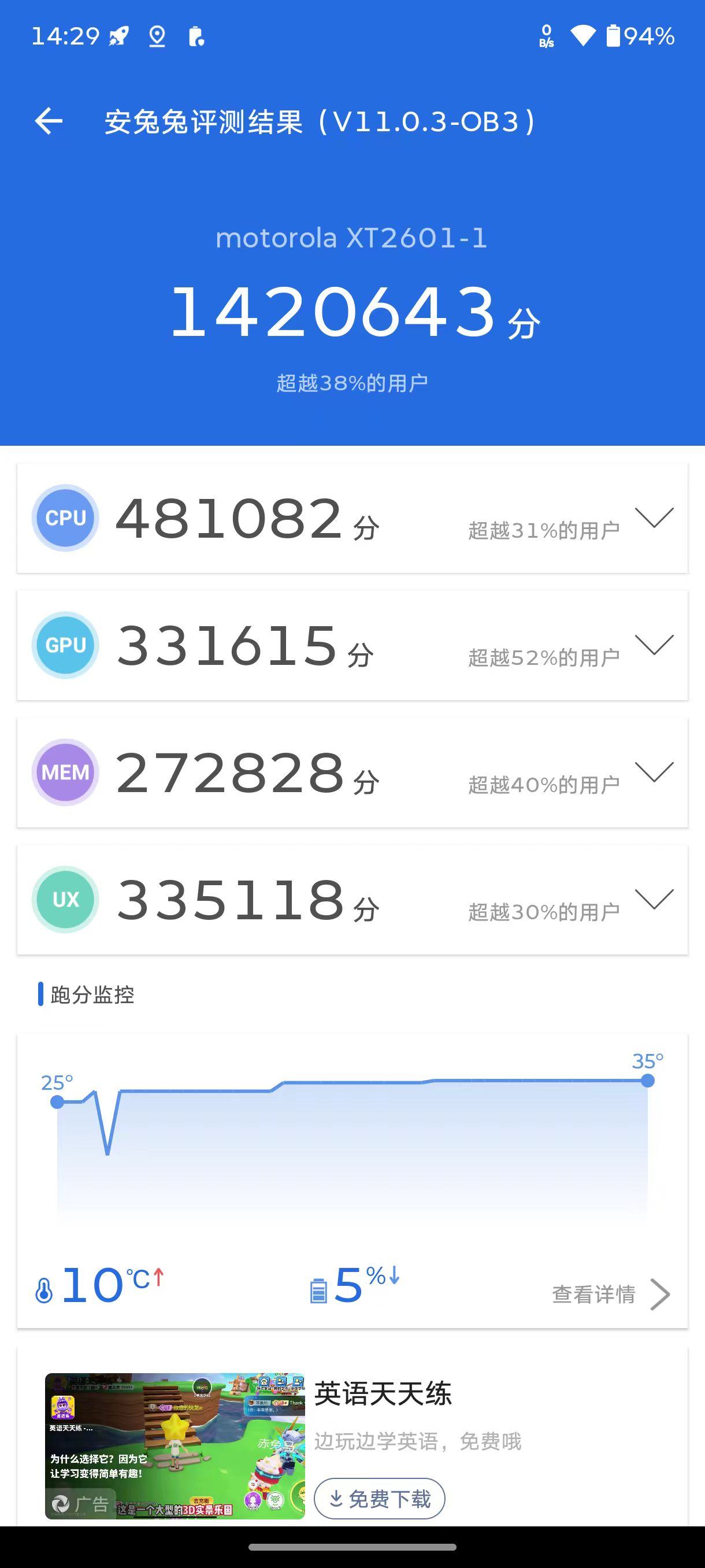 性能上,联想moto X70 Air搭载骁龙7 Gen 4移动平台,台积电4nm制程,1+4+3核心架构。实测安兔兔跑分142万分,GeekBench 6也测得单核1333、多核4197的好成绩。