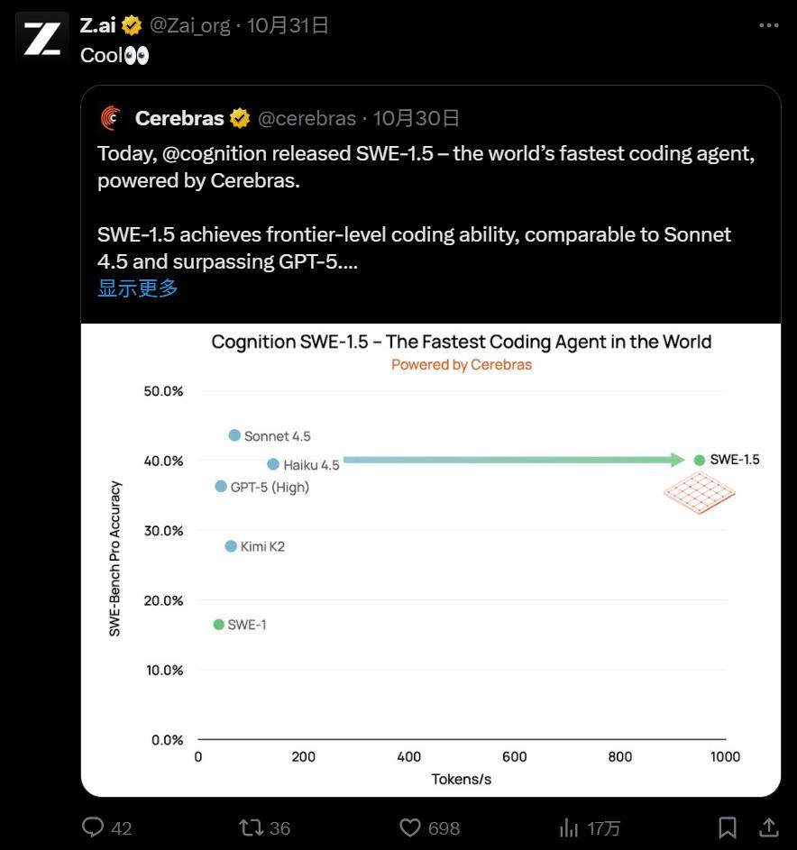 X 博主 @deedydas 认为,Cognition 的 SWE-1.5 是基于中国公司智谱的 GLM 4.6 模型进行定制(精调 / 强化学习),并运行在 Cerebras 的硬件上;Cursor 的 Composer 模型也带有中国式推理痕迹。