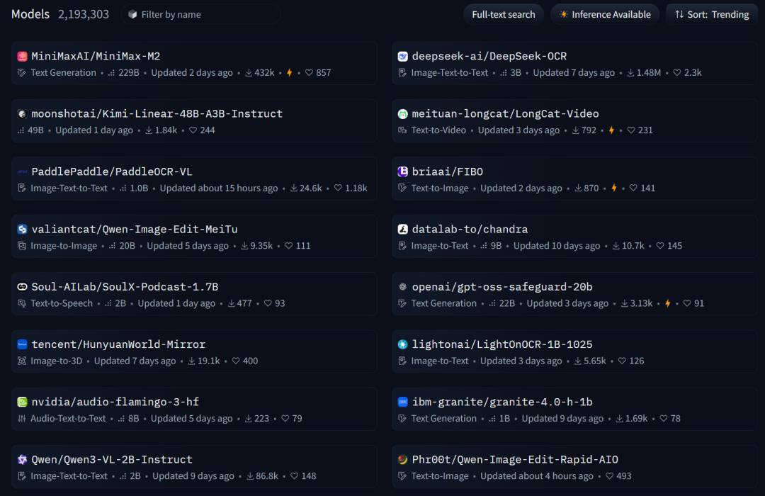除此之外,在 AI 社区 HuggingFace 的趋势榜上,排行前列的模型都出自国内公司,有 MiniMax、DeepSeek、Kimi、百度、混元、千问,还有美团的 LongCat。