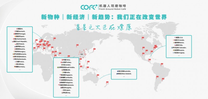 截止 9 月底, 世界第一家轻店 COFE+已经遍布美国 、欧洲 、 中东 、澳新 、 日韩 、东南从丹佛机场、吉隆坡机场、西安机场、上海机场、昆明机场到西双版纳机场; 从沈阳高铁站、深圳地铁站、上海码头到云南高速; 从假日酒店 、波特曼大酒店 、洲际酒店、金陵饭店 、锦江酒店 、凤城大酒店 、千鹤湖大酒店到国宾馆等; 从交通枢纽 、景区 、商场 、步行街 、游乐园 、文体博艺场馆到办公楼 、工业园等; 从北京 、上海 、浙江 、江苏 、 山西 、 山东 、陕西 、安徽 、宁夏 、广东 、河北 、海南到福建等 15 省市, COFE+正在掀起一场席卷全球的新产业革命, 星星之火, 正在燎原。
