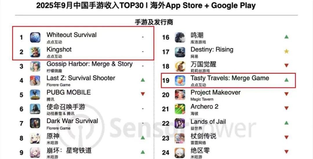 该产品连续多月位居中国手游出海收入榜榜首,截至9月底,全球收入约合250亿人民币;《Kingshot》2月接棒上线,延续猛烈攻势,全球累计收入已超4亿美元。
