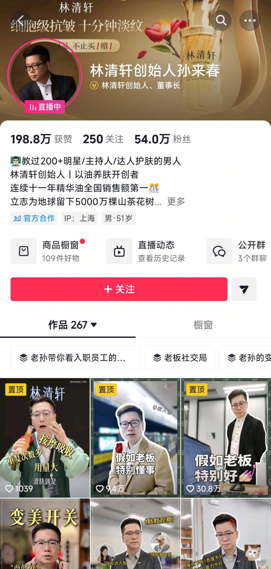 林清轩则另辟蹊径,以创始人IP为核心驱动品牌破圈。创始人孙来春亲自入驻抖音,开设账号「林清轩创始人孙来春」,不仅高频次直播带货,在双11期间贡献了1000万至2500万元的销售额,还持续发布短视频内容引流。