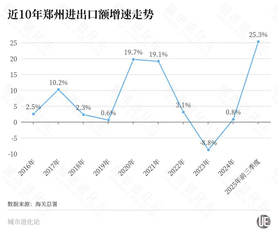 回顾过去几年的数据,郑州外贸进出口额增速曾出现剧烈波动。在2020年连续两年出现两位数增长后,郑州该指标一度跌至-8.8%,直到今年一季度,一举增长至37.4%,并到前三季度维持25.3%的增速。