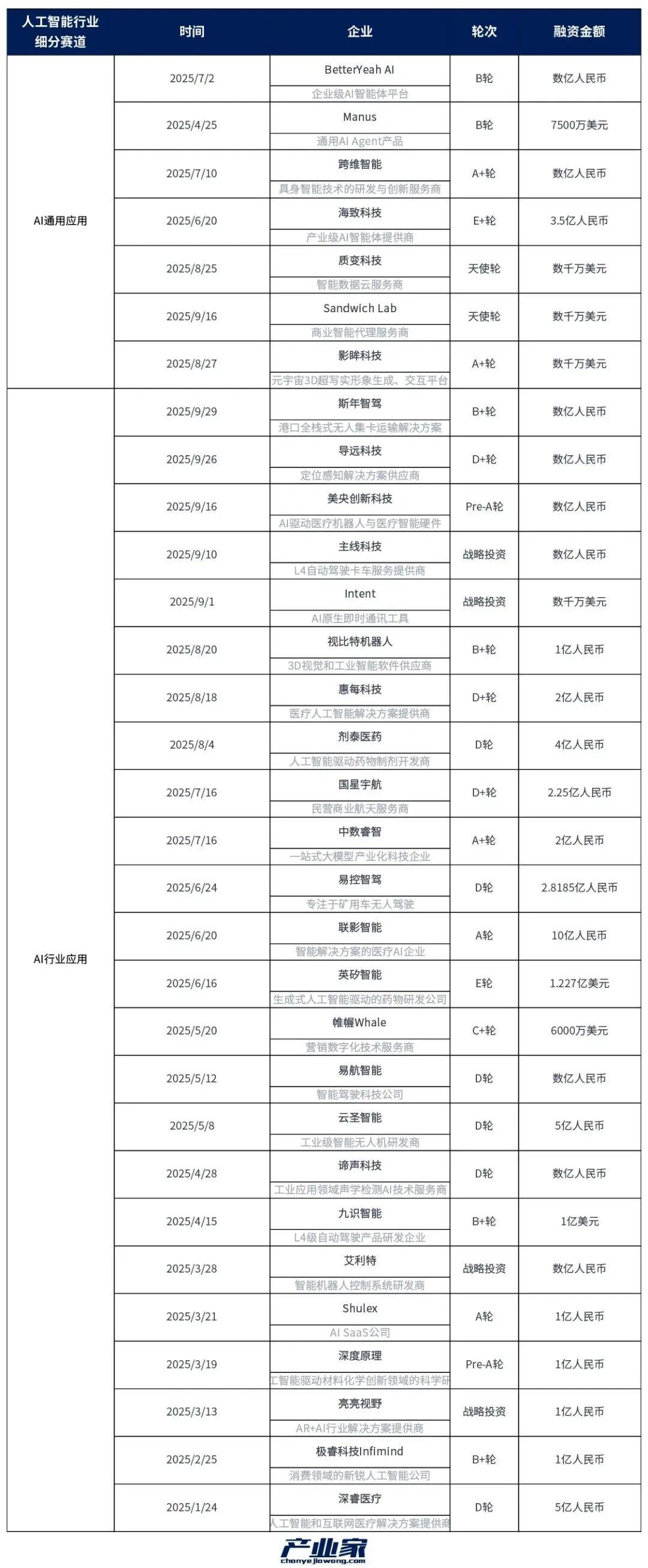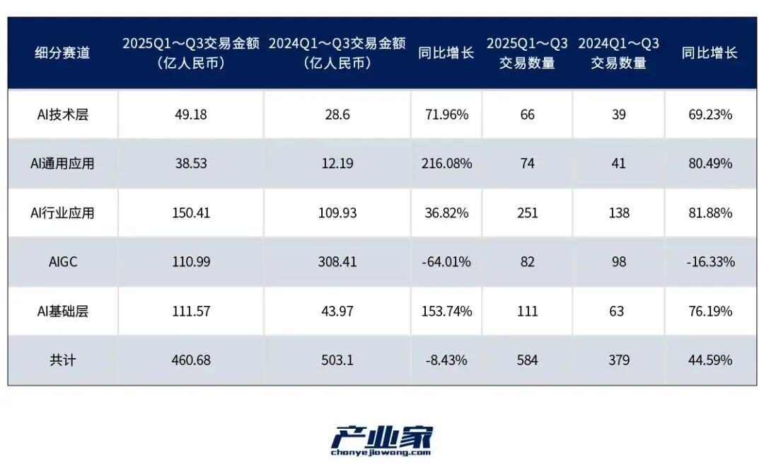 据产业家统计,2025年前三个季度,人工智能领域一级市场共发生548起交易事件,同比增长44.59%,具体到细分赛道上,AI通用应用和AI行业应用占据近一半,成为增长最迅猛的两条主线;在交易金额上,AI行业应用则跃升为资金最集中的洗到赛道,达到150亿元。