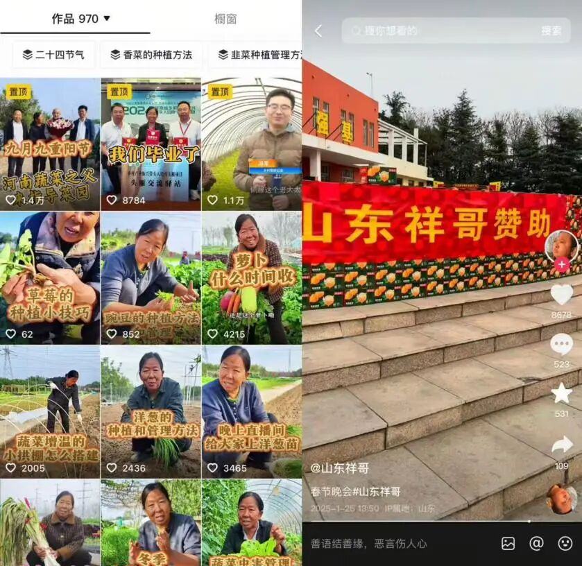 如今助农赛道愈发成熟,博主类型也逐步细分。除了走田园诗意路线的李子柒外,乡村日常纪实类内容也非常火爆,李福贵就属于这一细分领域;此外还有一些农技知识科普类的博主,例如分享《香菜的种植方法》《韭菜种植管理方法》《豆角小技巧》等内容的@生菜杨姐,以及以涵盖乡村特色娱乐内容的博主,例如说段子、在村口搭建“小舞台”带乡亲们表演并直播的@山东祥哥。
