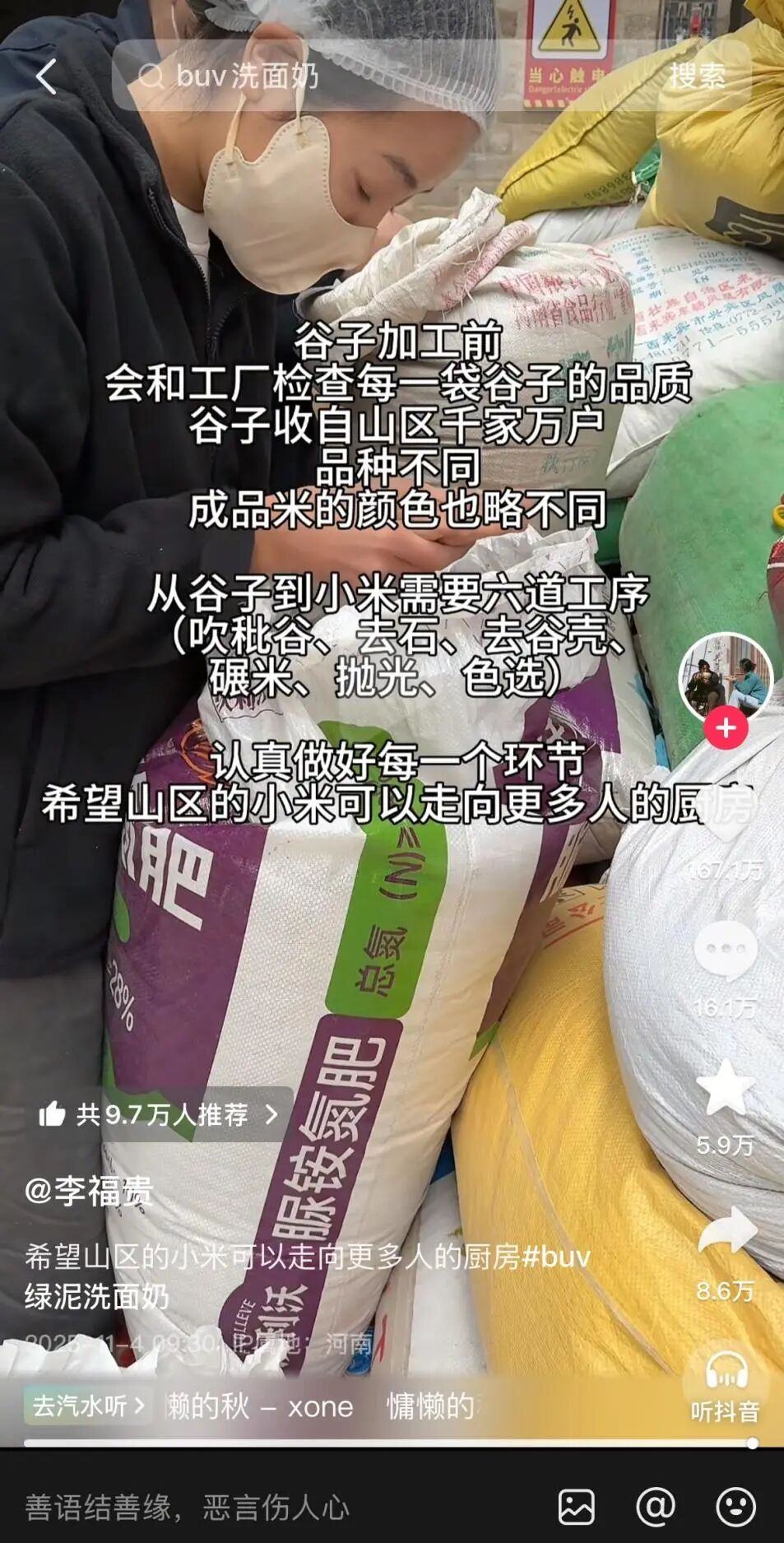 据了解,李福贵此次带货谷子背后,也是与当地政府合作,政府牵头找了工厂,李福贵收购+直播共同完成的一次助农之举。该产品最终销售价格是7~8元每斤,收来的谷子到成品中间完成了6道工序,利润非常微薄。