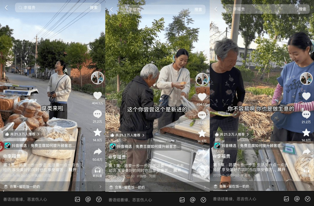 但真正让李福贵的内容注入灵魂的,是她在走街串巷卖货过程中,与村民们的自然互动。