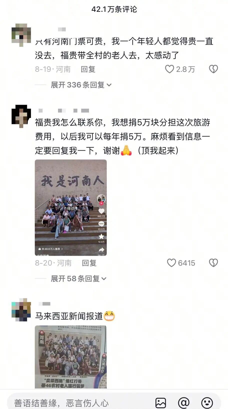 另一个值得注意的点是,李福贵的视频出镜的大多数是老年人,农村留守老人是这几年大众比较关注的社会议题,这也让李福贵的视频锁定了很多目光。8月李福贵发布的带着40多名村民去旅游的视频,也让更多人看到了乡村留守老人的真实处境,很多人都没出过远门,甚至连村子附近的县城都很少去过。