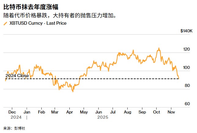 另一大重灾区是加密货币。比特币从10月份的12.6万美元开始下跌,并一度跌破9万美元。