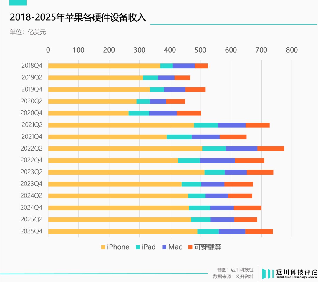 一是iPhone/Mac/iPad三大产品线,是苹果硬件收入的绝对主力。虽然库克在任期内和发布了一系列新产品,但占整体硬件收入比重从未超过10%。