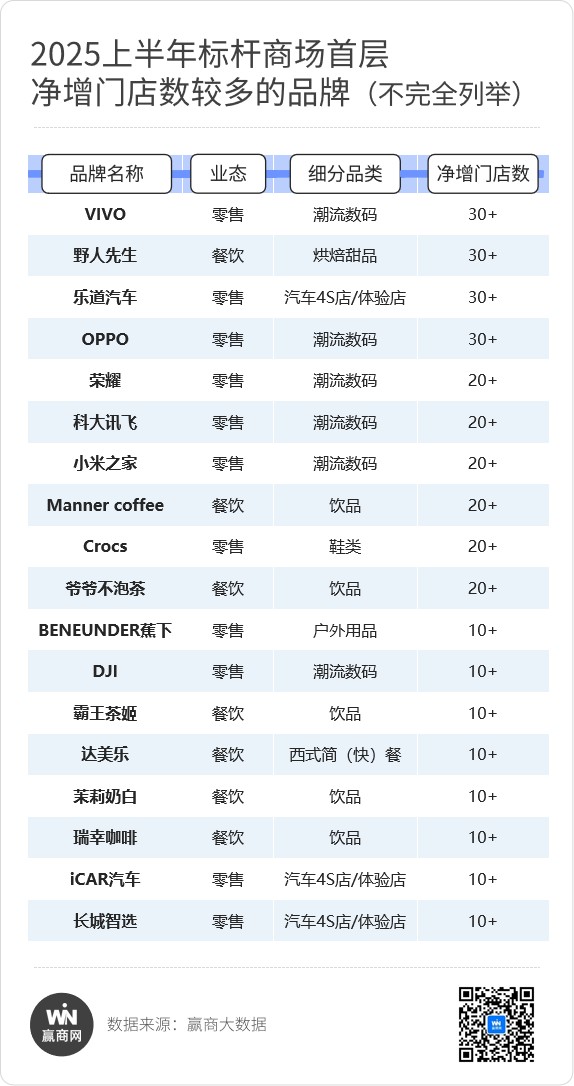 细看品牌,拥有政策补贴加持的潮流数码,以及消费门槛低、花样繁多的饮品最受首层青睐。此外,虽经历过一波撤退潮,但商场仍是新兴汽车体验店打开大众知名度、展示创新技术的首选地。
