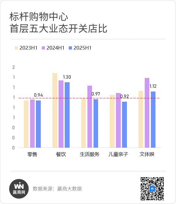 据赢商大数据统计,近两年新开业的商场首层加码主打体验的业态。餐饮占比近三成,高于非新商场4.2个百分点;文体娱2.04%,高于非新商场0.9个百分点;零售64.79%,低于非新商场2.2个百分点。(新商场:2024-2025开业的商场;非新商场:2024年之前开业的商场)