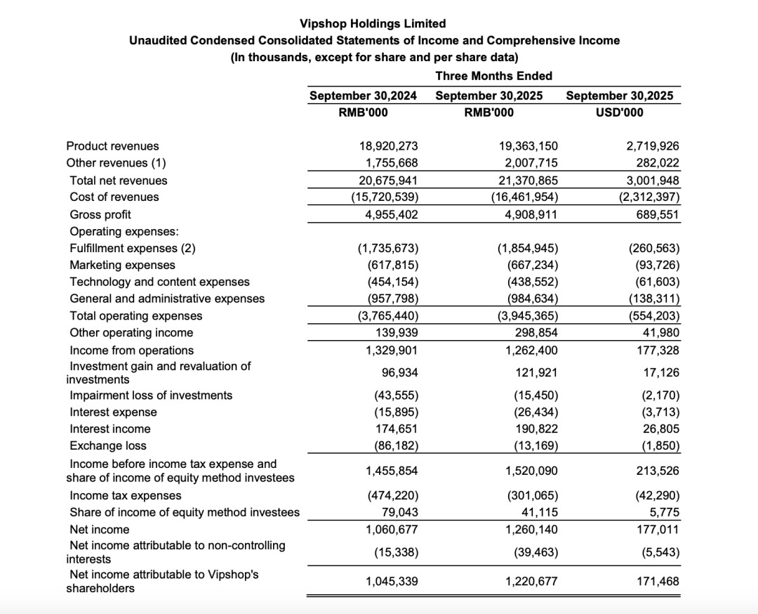 中国特卖电商龙头唯品会近日发布2025年第三季度财报。