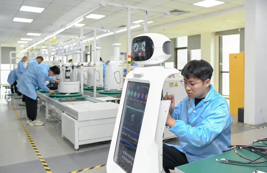 |在临汾晋创谷,临汾创泽具身智能机器人生产线,技术人员在流水线作业。