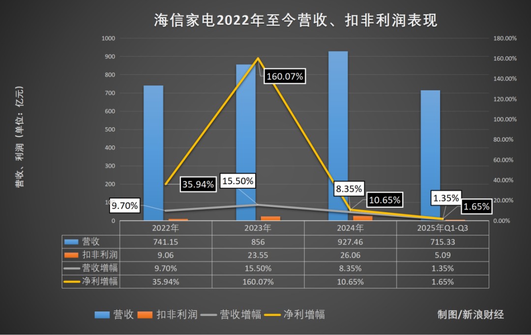 在她掌权期间,海信家电先后发布了三个季度的财务数据。《BUG》栏目统计发现,仅看2022年-2025年前三季度数据,今年的营收增速和扣非净利润增速均创新低,且大幅低于往年同期。