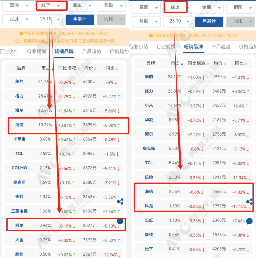 但从结果来看,目前这一改革计划的成效并未凸显。据奥维云网监测数据:2025年1月1日—10月30日,海信家电旗下海信、科龙品牌空调线下市场占有率分别为10.29%、0.96%,同比增长0.87%和-0.15%;同期,海信、科龙空调线上份额分别为2.55%、1.63%,分别下滑0.6%及0.28%,线上均价也同比下滑4.02%和11.15%。