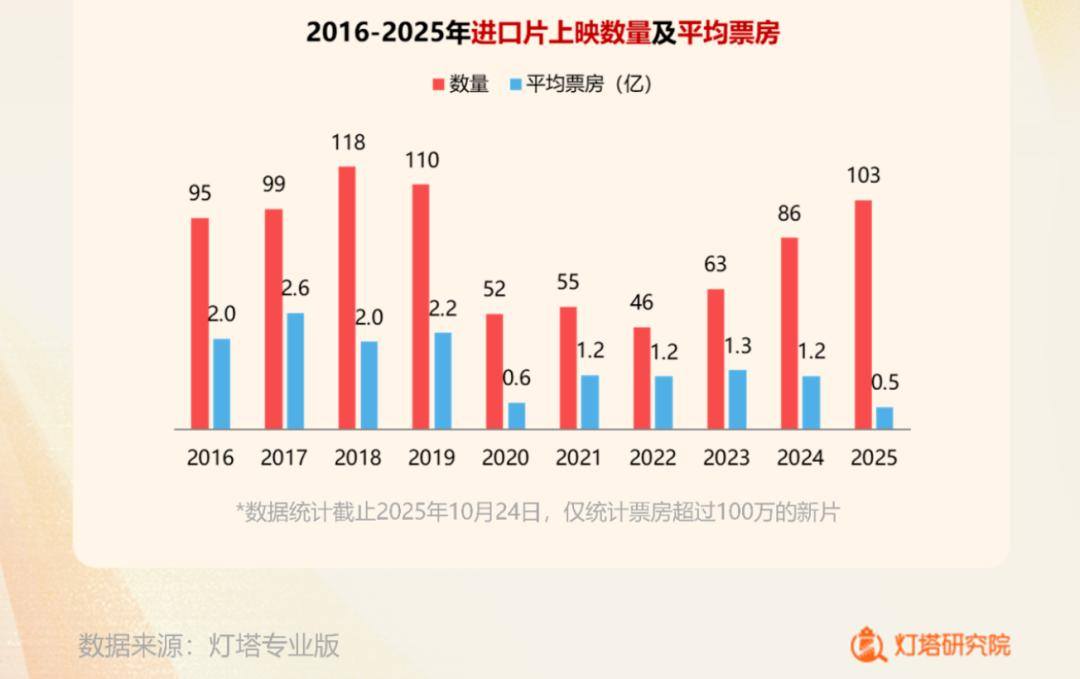 根据大麦娱乐灯塔研究院发布的《2025中国电影市场及观众变化趋势报告》,截至2025年10月24日,票房超过100万的新片中,进口片平均票房仅为约0.5亿元,这是过去10年的最低点;大盘占比方面,进口片票房占比仅为11%,这同样是10年来的低谷。
