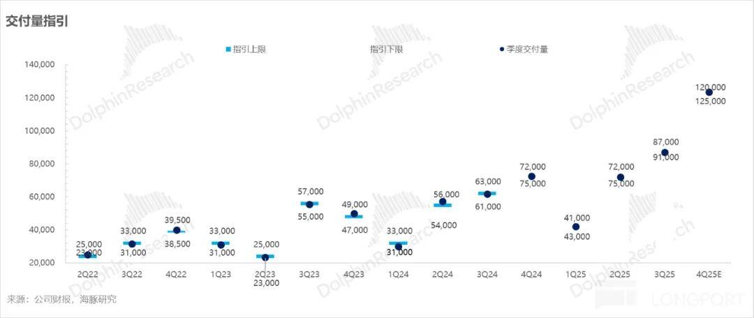 在最关键的四季度指引上,四季度销量指引 12 万-12.5 万,低于市场预期的 13.6 万辆,由于四季度是蔚来 ES8 和乐道 L90 两款爆销新车的完整交付季,而由于 ES8 的爆销(9 月蔚来新车 ES8 SUV 上市,整体订单量预计达约 9.6 万辆,10 月新增整体订单量约 4 万辆),而 ES8 目前的等车周期也来到了 22-23 周,交付时间顺延至 2026 年。