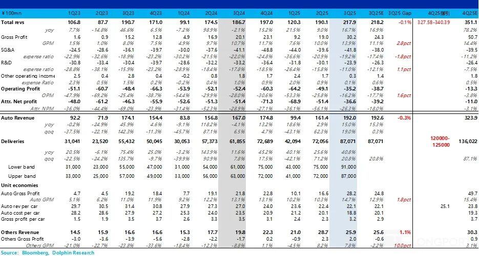 2. 整体收入端基本和市场预期持平:三季度整体收入 218 亿,基本和市场预期持平,而最核心的卖车收入 192 亿,环比提升 19%,主要由于蔚来三季度 L90 的爆销。