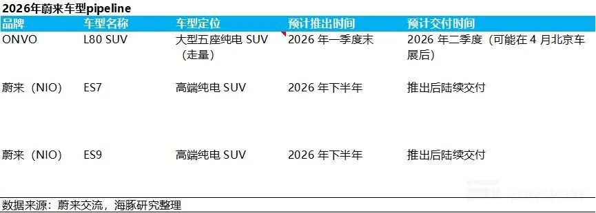 从蔚来自身的新品周期上,明年将推出 ES 9, 五座 SUV ES7, 以及乐道 L80 三款车,而能承担走量任务的主要是 ES7 和乐道 L80 这两款车。