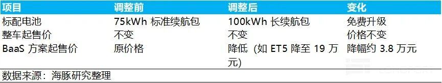 蔚来于 8 月 29 日成都车展上对于旗下全部车型标配 100kWh 长续航电池包,整车起售价保持不变(即与之前搭载 75kWh 标准电池包时价格相同),同时对全系 BaaS 方案下起售价也降低了 3.8 万元。