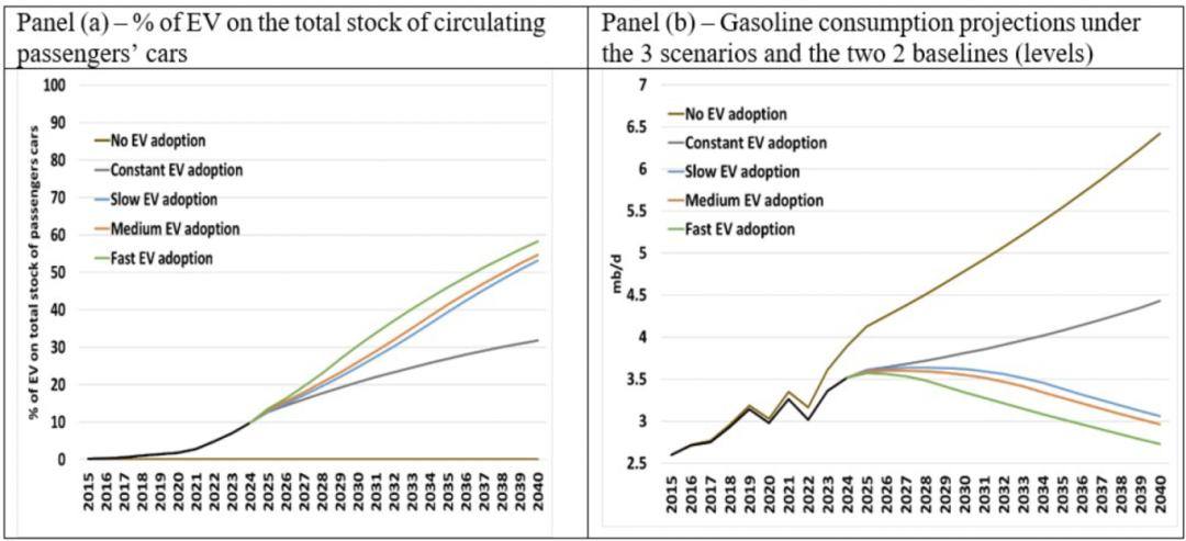 (ii)预测了在不同电动汽车普及路径下直至2040年的汽油需求;