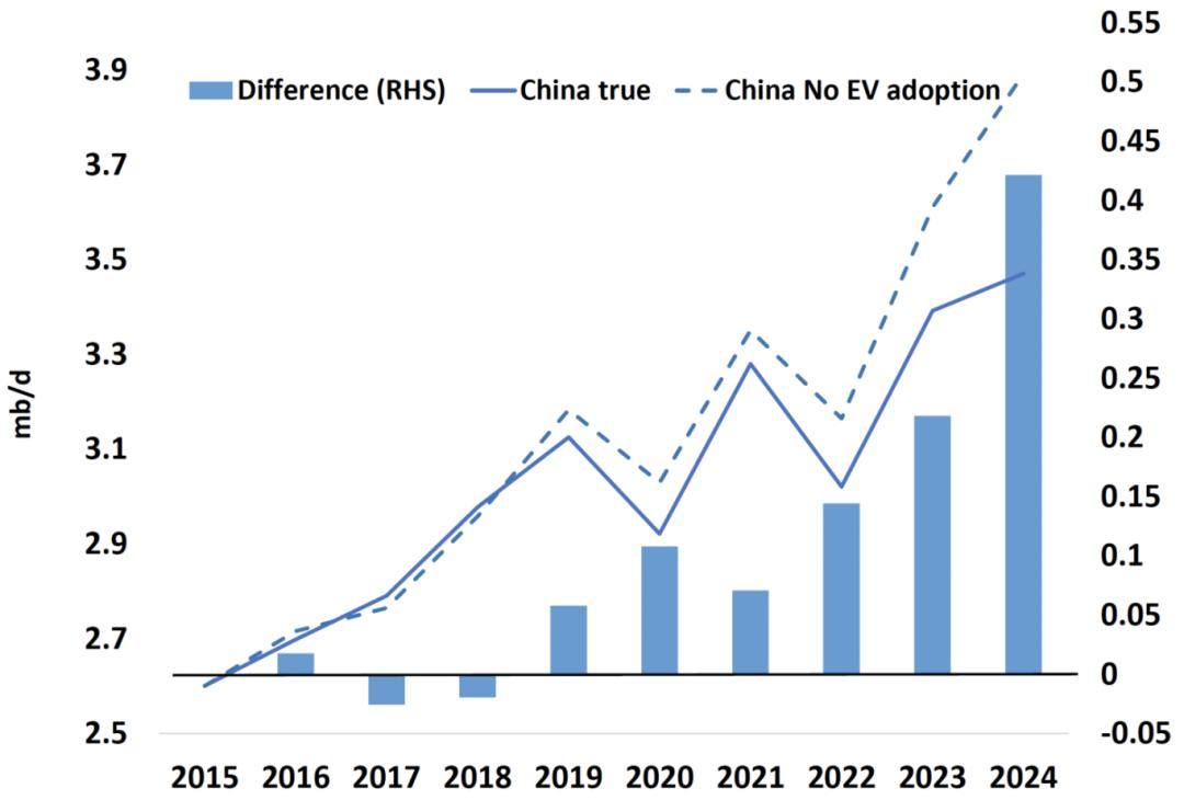 研究者分析表明,中国电动汽车的快速普及是近期该国石油消费趋势的主要驱动因素。仅2024年一年,电动汽车的普及就替代了约43万桶/日的汽油消费。