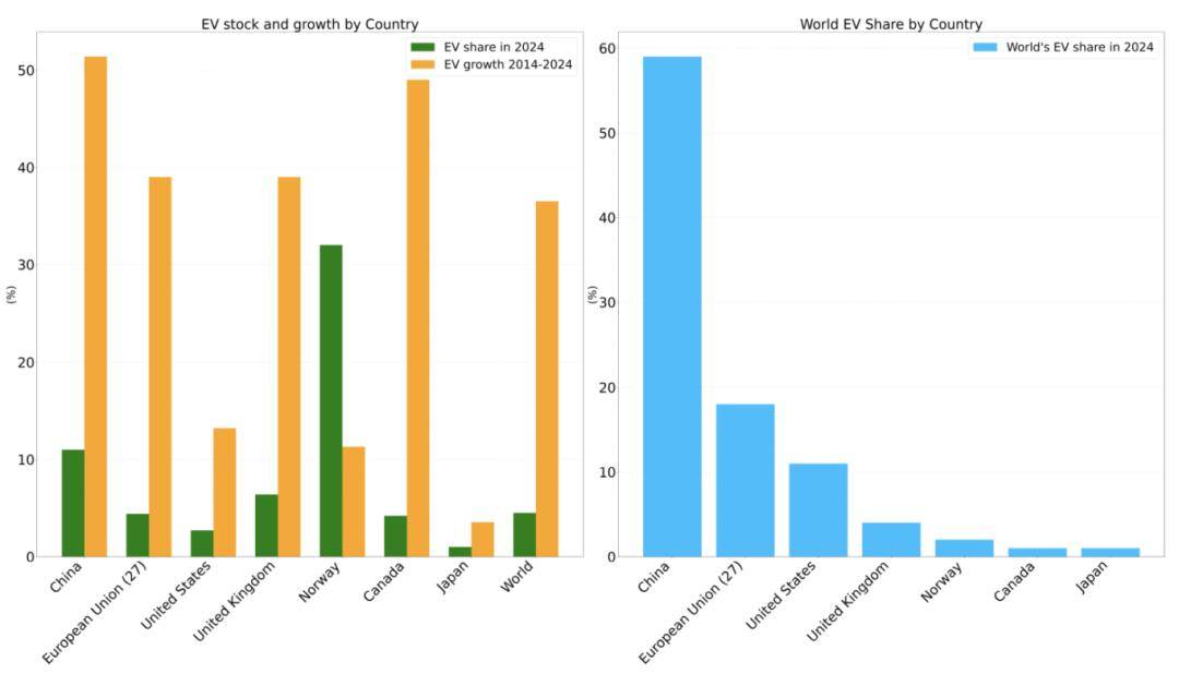 按照图3分国别电动乘用车保有量与增长,2024年,电动汽车占中国新车销量的比重25%,占国内汽车总保有量的11%,其普及率仅次于挪威,而中国电动汽车数量约占全球电动汽车总量的60%。