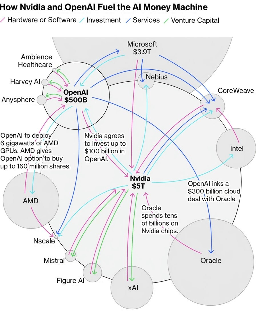 最近,一张资本内循环的示意图在硅谷疯传,箭头从投资者指向 OpenAI,从 OpenAI 指向英伟达,再从英伟达绕回 OpenAI 的股东名单。钱在几家科技巨头之间画了一个圈,成为了 AI 繁荣在市场层面的写照。