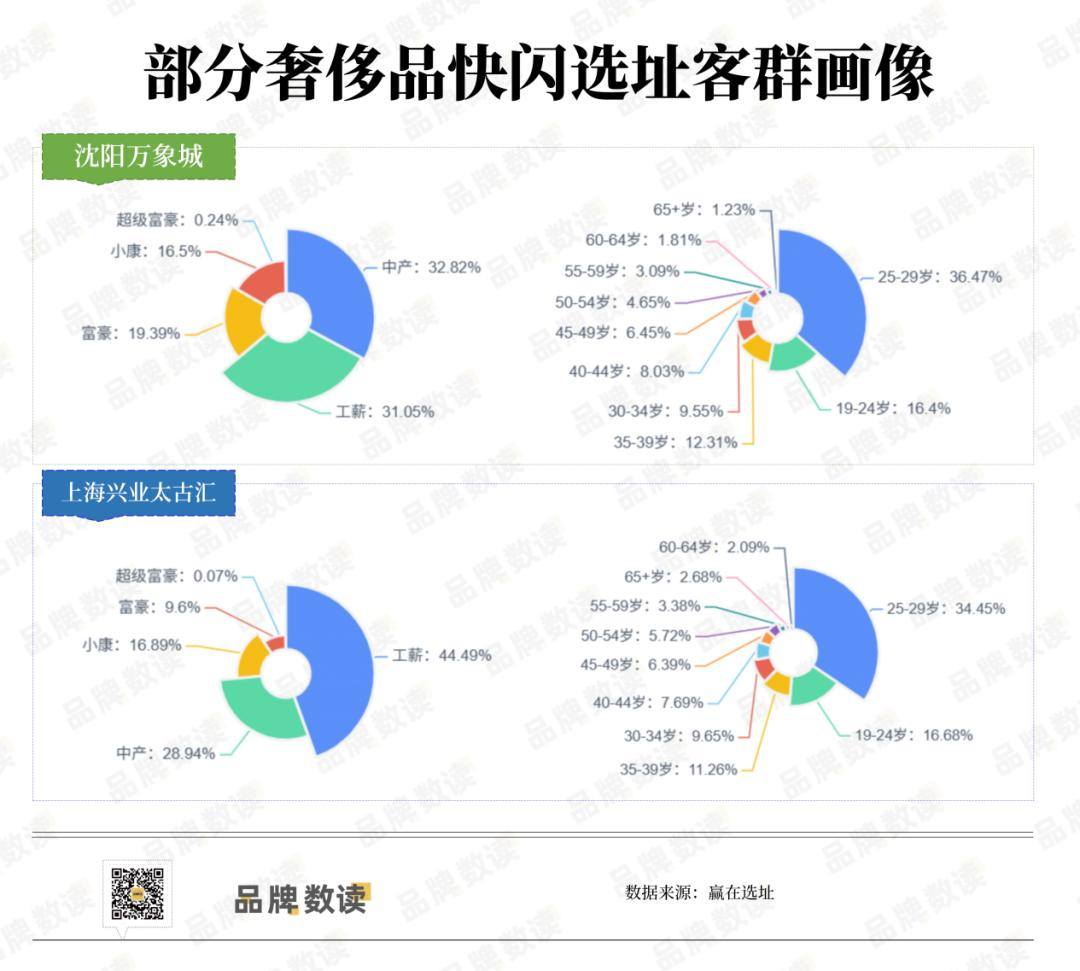 以LV今年入驻开设快闪店和常态店的沈阳万象城及上海兴业太古汇为例,赢在选址系统显示,这两个购物中心的客群主要为25-29岁的年轻消费者,其次是19-24岁的00后消费群体,且以工薪及中产消费者为主。