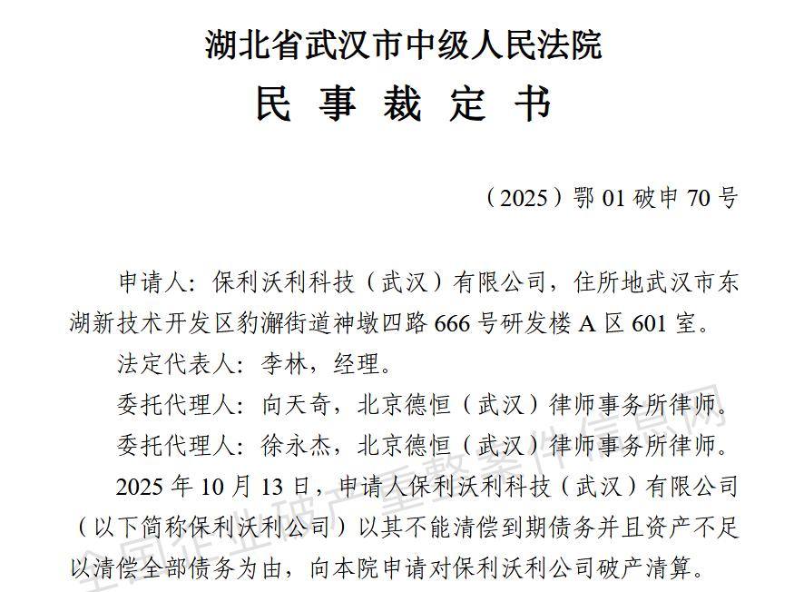 近日,保利沃利科技武汉有限公司(POLYVOLY)的破产清算获得法院受理,理由是不能清偿到期债务且资产不足以清偿全部债务。申请破产之前,公司已被超20家企业告上法庭。