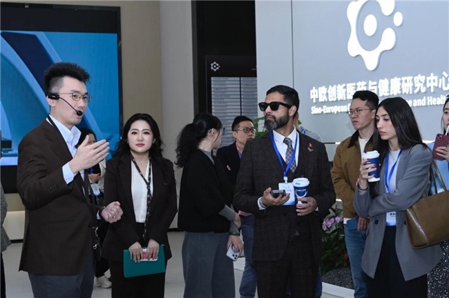在工作人员的带领下,来访团队参观了中欧医药中心的展示中心、创新平台、孵化空间及多项创新成果。团队成员对中欧医药中心在先进治疗、数字健康、长寿医学等方向打造的技术体系和科研场景表现出浓厚兴趣,并对中欧医药中心能够提供的项目落地、加速服务、合规路径规划、国际化支持等服务表示高度关注。