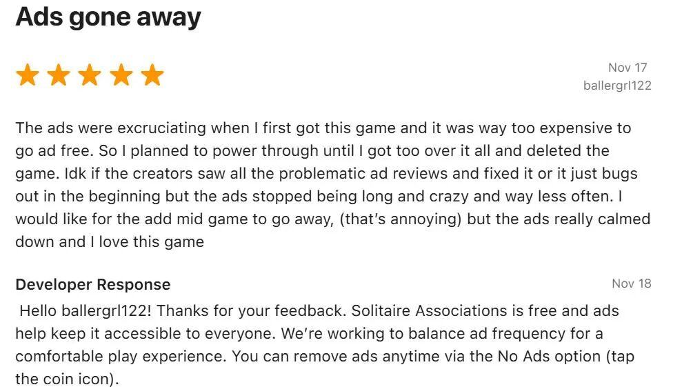 这一番改造,从内购和商店评价来看,玩家还是比较买单的。App Store 上虽然有一些评论还是对广告频率有意见,但措辞都柔和了不少。最高赞的评论更是直接赞美 HitApps“听话”,终于给了去广告内购;厂商也积极给出了回复,表示还在进一步优化 IAA 设计。