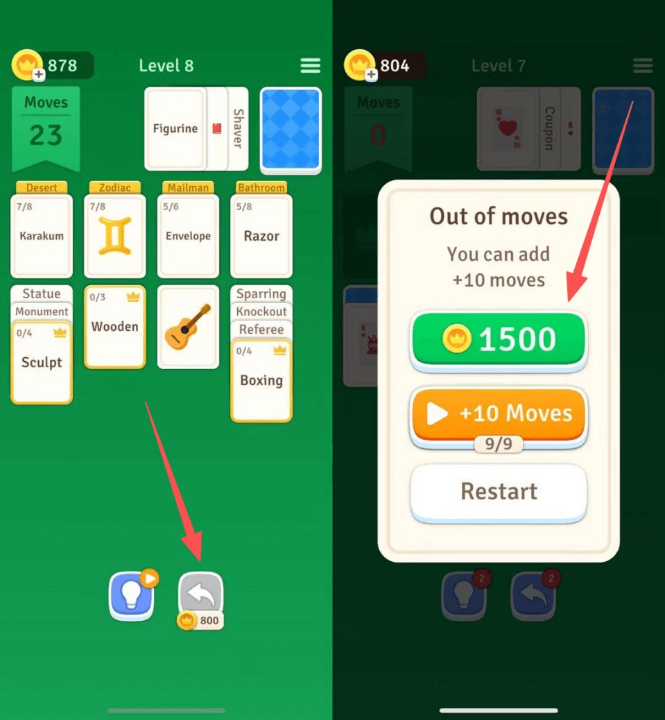 目前内购资源“金币”的主要用处有 2 个,一个是购买悔牌机会(左图 1),另一个是购买续命(左图 2)。虽然续命更贵,但续命也可以通过看广告换取 | 图片来源:Solitaire Associations Journey