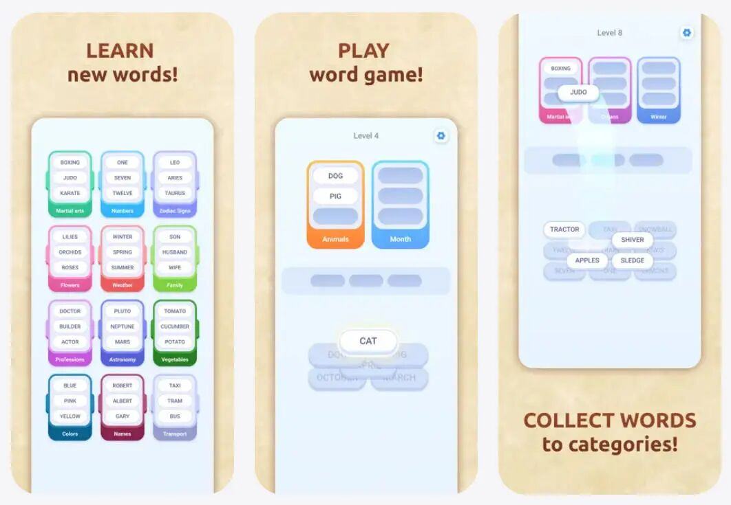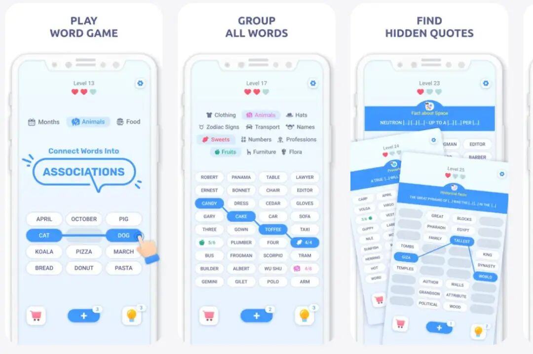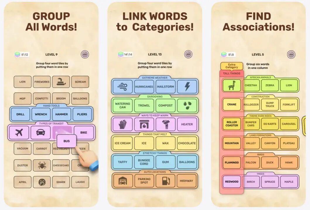 最早上线的「Associations Word Connections」只是单纯的让玩家根据单词所属类别连线分类 |图片来源:Associations Word Connections
