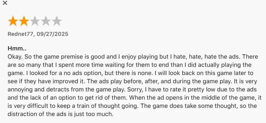 这些设计其实都还比较正常,但问题在于当时游戏本身还有插播视频广告,而且展示频率相当高,基本上每隔 10 分钟就强行展示一次,时间不低于 30 秒,还不能付费去除。要知道游戏在第 2 关开始难度就已经很高,通关时间也迅速逼近和超过 10 分钟。在被高难度关卡搞得焦头烂额的时候频繁插播广告,玩家自然相当搓火,相关差评也成了 App Store 的高赞评论。
