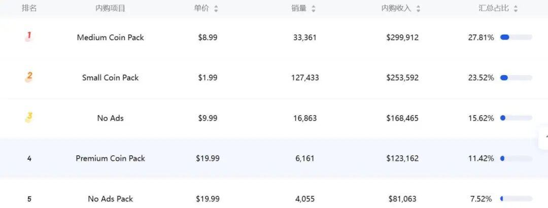 目前游戏在美国 iOS 端流水占比前 3 的内购商品分别是中等金币包(1500 枚,正好是续命 1 次的价格)、小型金币包以及永久去除插播广告 | 数据来源:点点数据