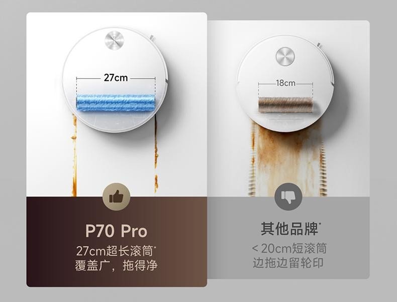 有时扫地机打扫后会留下水印,以及滚筒的覆盖面积有限,导致扫地机需要多次来回打扫,清洁效率低下。而P70 Pro采用的超长滚筒配合超细绒拖布,覆盖的清洁面积广,且容污率高,行走轨迹一次净。更突破性的是滚筒外摆设计,机器贴墙时自动延展,实现真正的“零距沿边清洁”。柜脚、踢脚线、马桶根部……这些长期被忽略的清洁死角,也终于迎来了彻底解放。