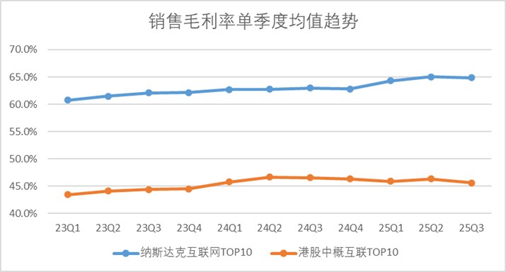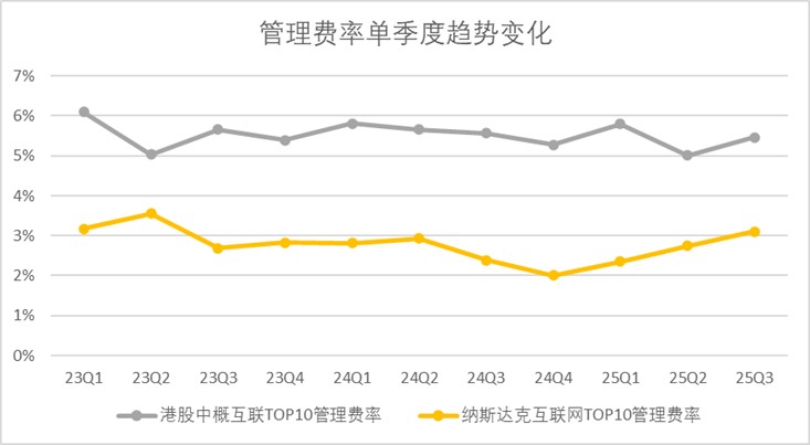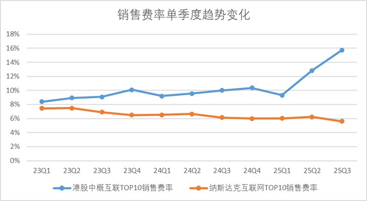 反观纳斯达克龙头互联网企业,市场竞争环境相对温和,整体销售费用率从2023年第一季度的7.4%下降至2025年第三季度的5.6%。
